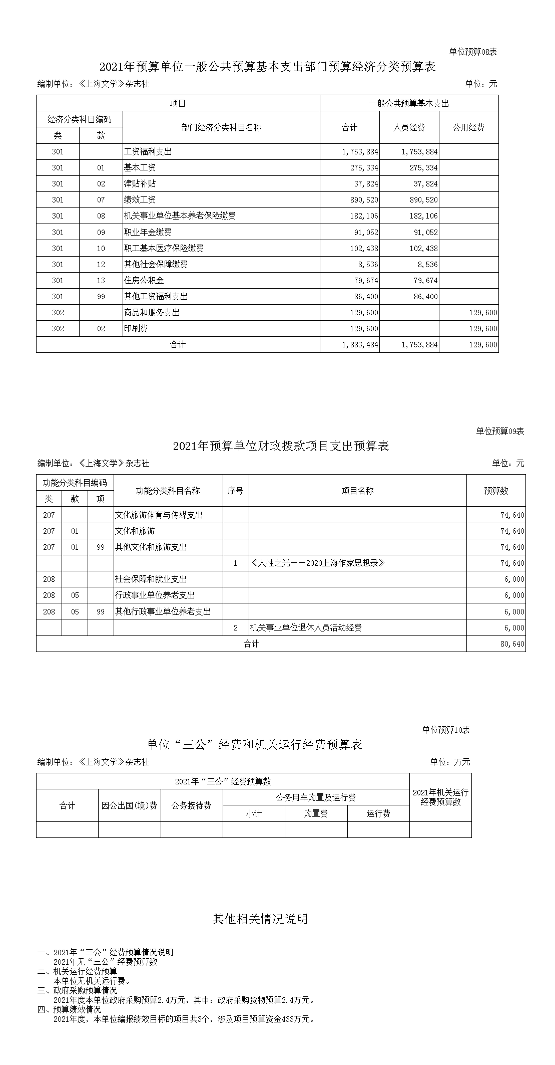 《上海文學》雜志社2021年度預算