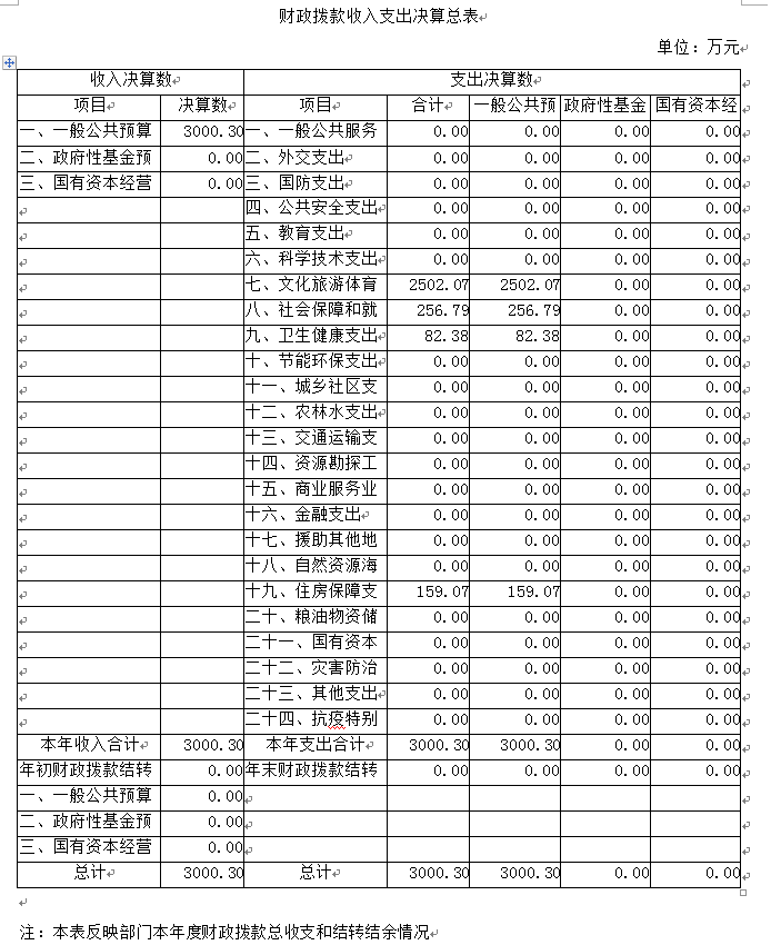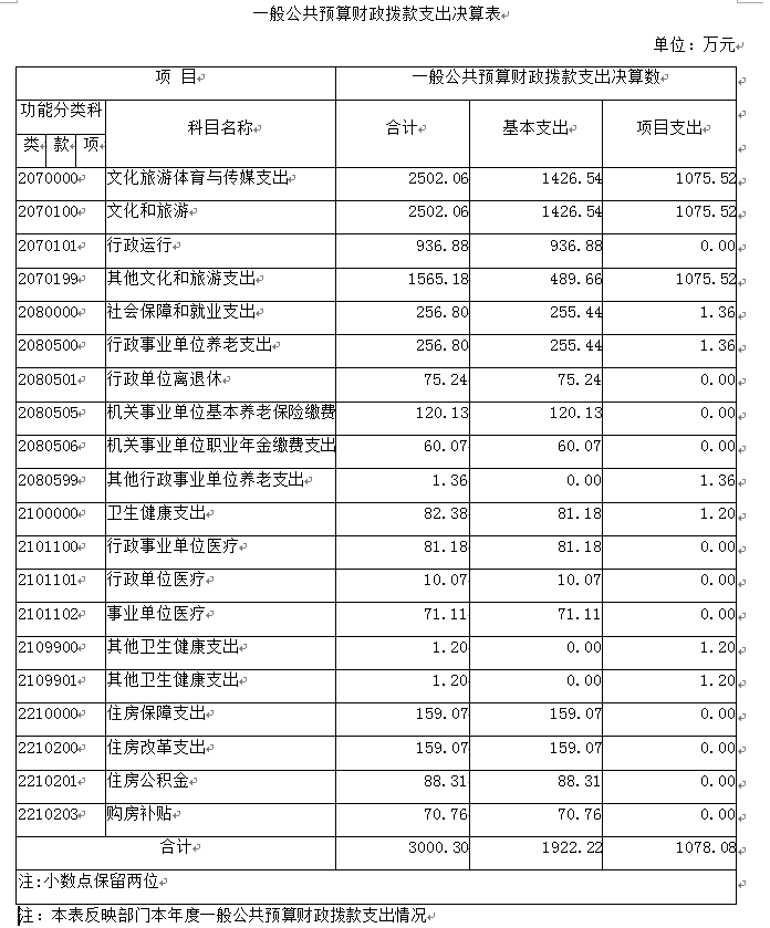 一般公共預算財政撥款支出3000.3萬元,主要用于以下方面:文化旅游體育與傳媒支出2502.07萬元,占83.39%;社會保障和就業支出256.79萬元,占8.56%;衛生健康支出82.38萬元,占2.75%;住房保障支出159.07萬元,占5.30%。