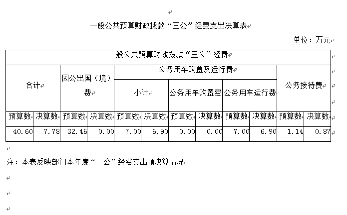 十、“三公”經費:指單位使用本級財政撥款安排的因公出國(境)費、公務用車購置及運行維護費和公務接待費。其中:因公出國(境)費反映單位參加國際合作交流、重大項目洽談、境外培訓研修等的國際旅費、國外城市間交通費、住宿費、伙食費、培訓費、公雜費等支出;公務接待費反映全國性專業會議、國家重大政策調研、專項檢查以及外事團組接待交流等執行公務或開展業務所需住宿費、交通費、伙食費等支出;公務用車購置及運行維護費反映編制內公務車輛的報廢更新,以及用于安排市內因公出差、公務文件交換、日常工作開展等所需公務用車燃料費、維修費、過路過橋費、保險費等支出。