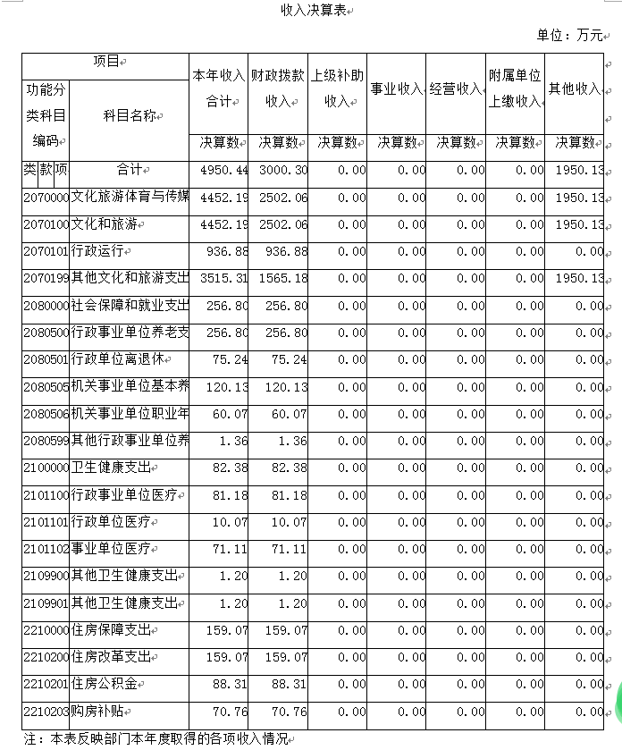 四、其他收入:指單位取得的除“財政撥款收入”、“事業收入”、“經營收入”等以外的收入。主要是:其他文化和旅游支出收入等。